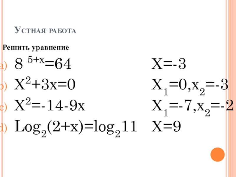 Устная работаРешить уравнение8 5+х=64Х2+3х=0Х2=-14-9хLog2(2+x)=log211Х=-3Х1=0,х2=-3Х1=-7,х2=-2Х=9