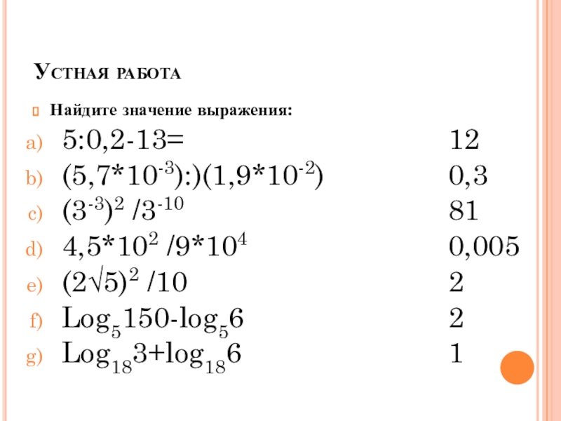 Устная работаНайдите значение выражения:5:0,2-13=(5,7*10-3):)(1,9*10-2)(3-3)2 /3-104,5*102 /9*104(2√5)2 /10Log5150-log56Log183+log186120,3810,005221