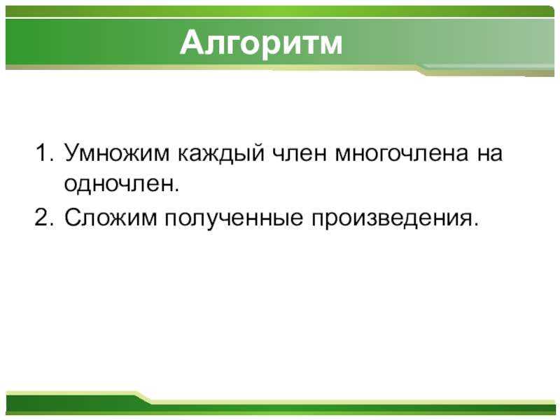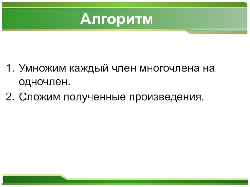 АлгоритмУмножим каждый член многочлена на одночлен.Сложим полученные произведения.