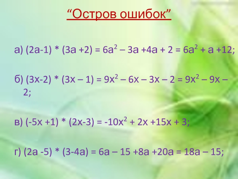 “Остров ошибок” а) (2а-1) * (3а +2) = 6а2 – 3а +4а + 2 = 6а2 +