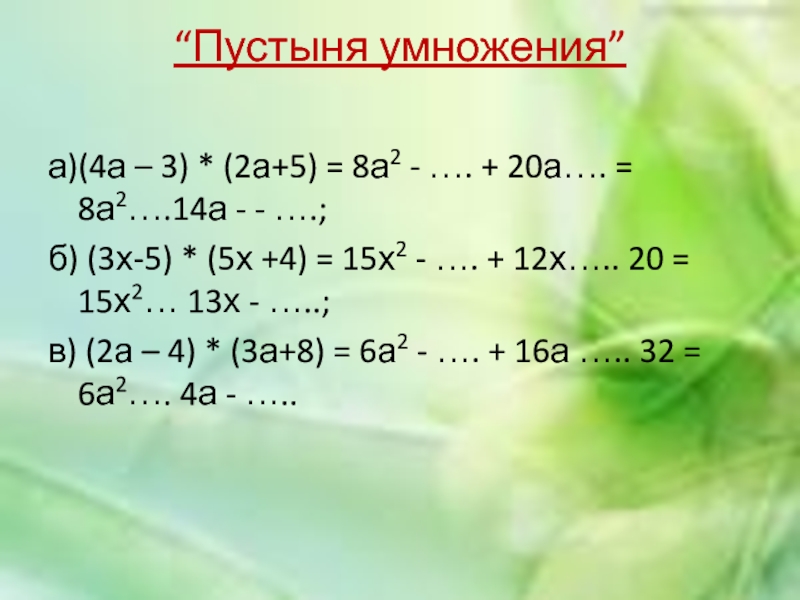 “Пустыня умножения”  а)(4а – 3) * (2а+5) = 8а2 - …. + 20а…. = 8а2….14а -