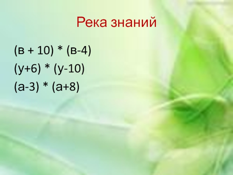 Река знаний(в + 10) * (в-4)(у+6) * (у-10)(а-3) * (а+8)