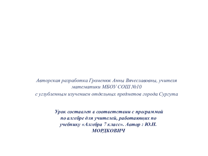 Урок составлен в соответствии с программой по алгебре для учителей, работающих по учебнику «Алгебра 7 класс». Автор : Ю.Н. МОРДКОВИЧ
