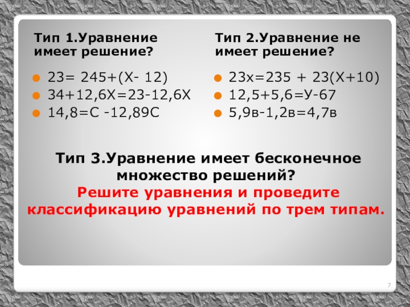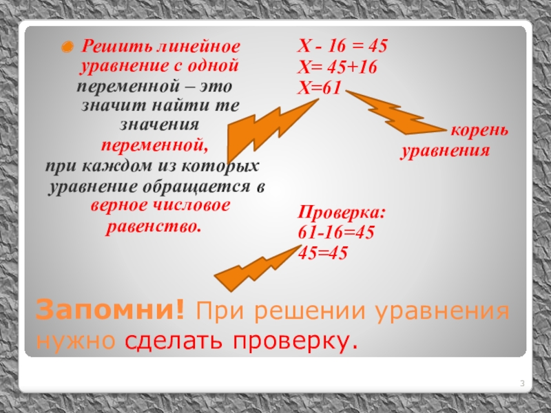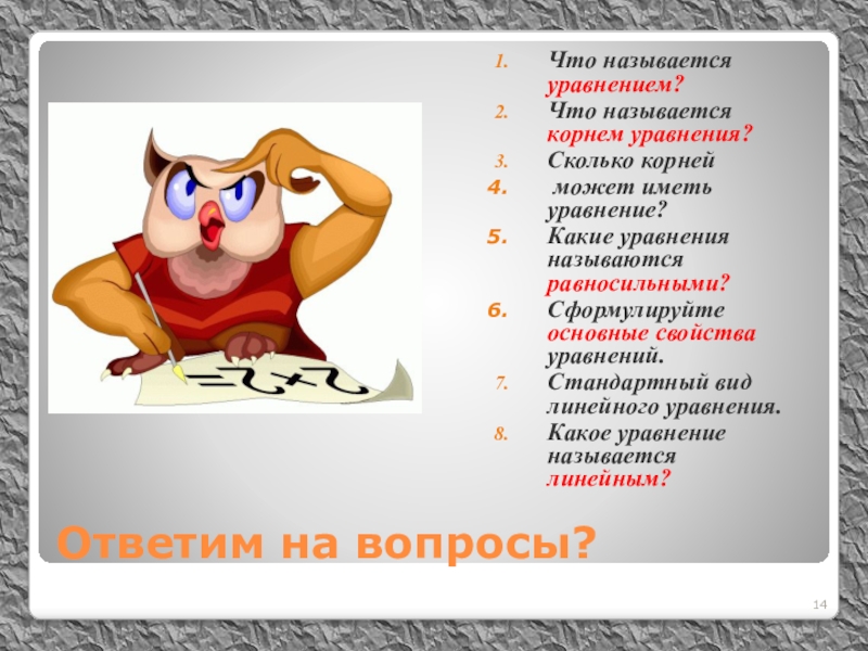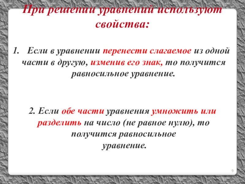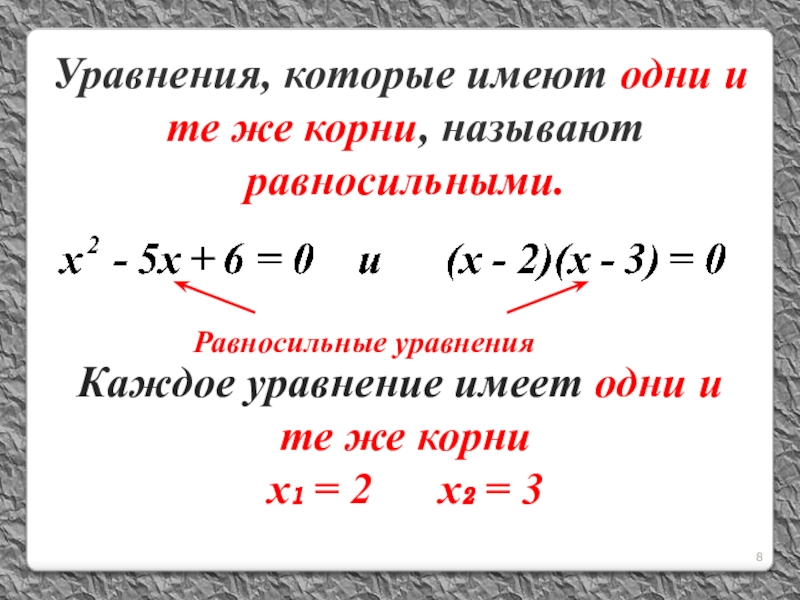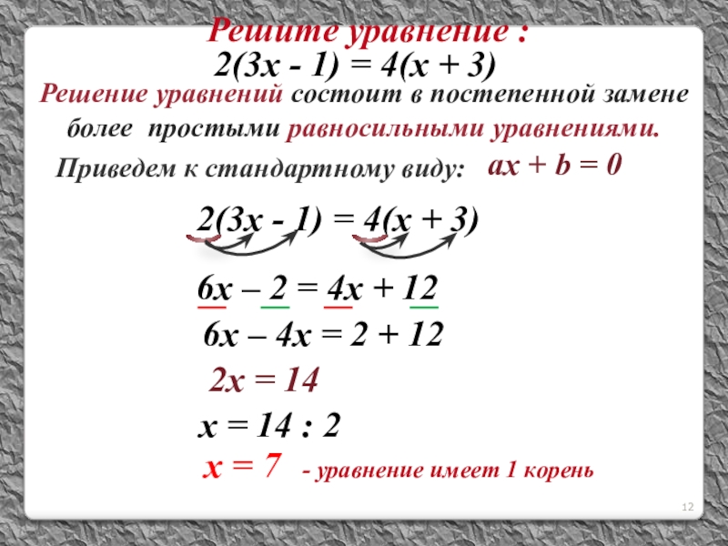 Решение уравнений состоит в постепенной замене более простыми равносильными уравнениями.
