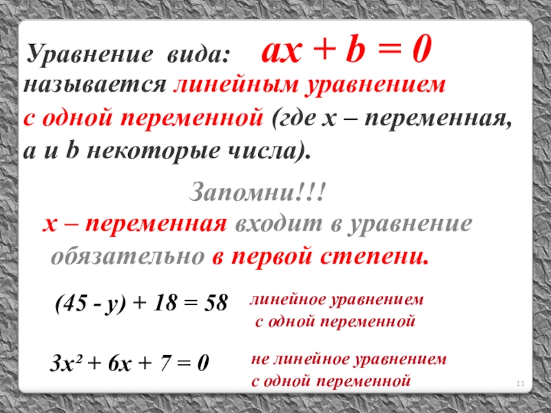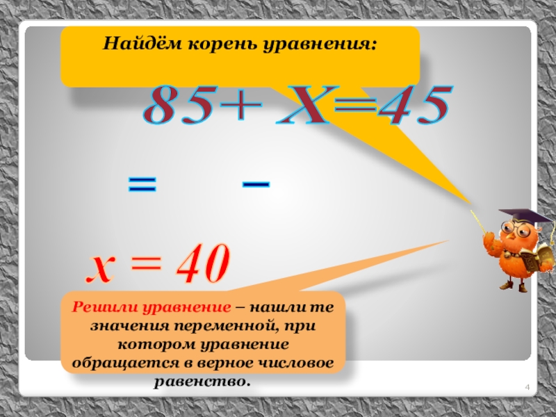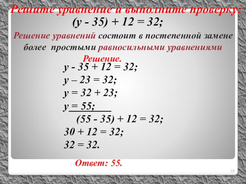Решение уравнений состоит в постепенной замене более простыми равносильными уравнениями