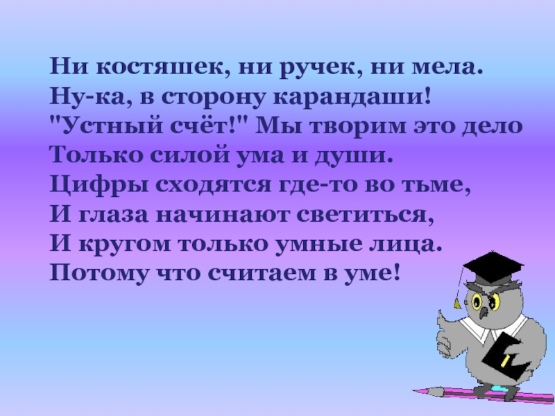 Ни костяшек, ни ручек, ни мела.Ну-ка, в сторону карандаши!