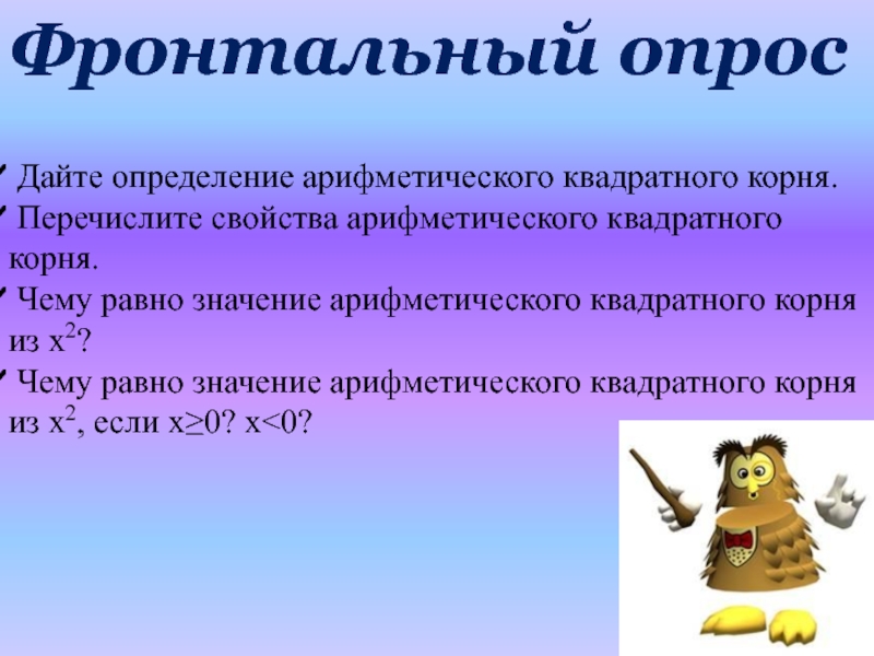 Фронтальный опрос Дайте определение арифметического квадратного корня. Перечислите свойства арифметического квадратного корня. Чему равно значение арифметического квадратного