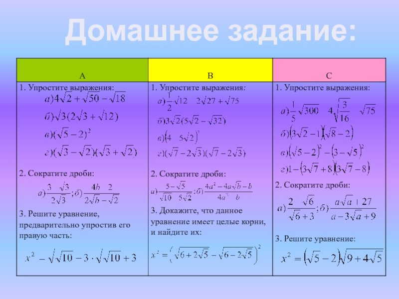 Презентация, доклад к уроку алгебры в 8 классе по теме Преобразование рац. выражений, содержащих корни