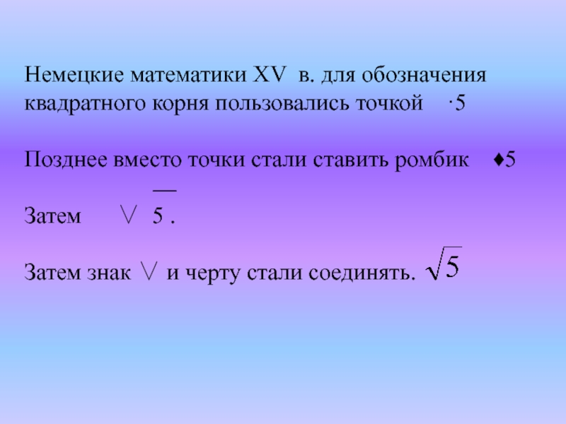 Слайд 16Немецкие математики XV в. для обозначения квадратного корня пользовались точкой