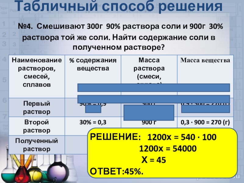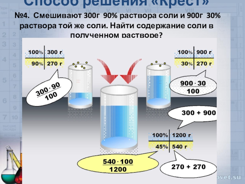 №4. Смешивают 300г 90% раствора соли и 900г