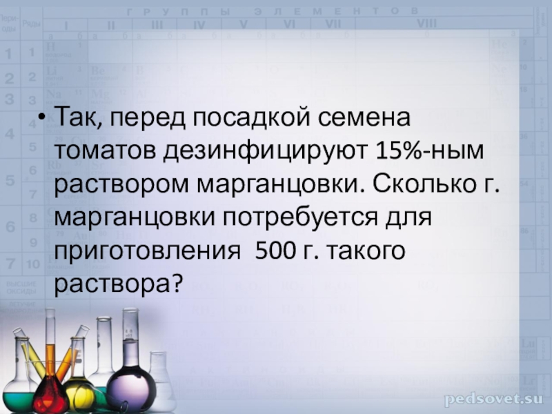 Слайд 11Так, перед посадкой семена томатов дезинфицируют 15%-ным раствором марганцовки. Сколько г.