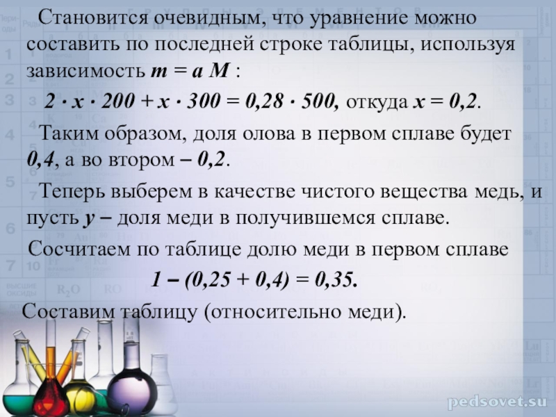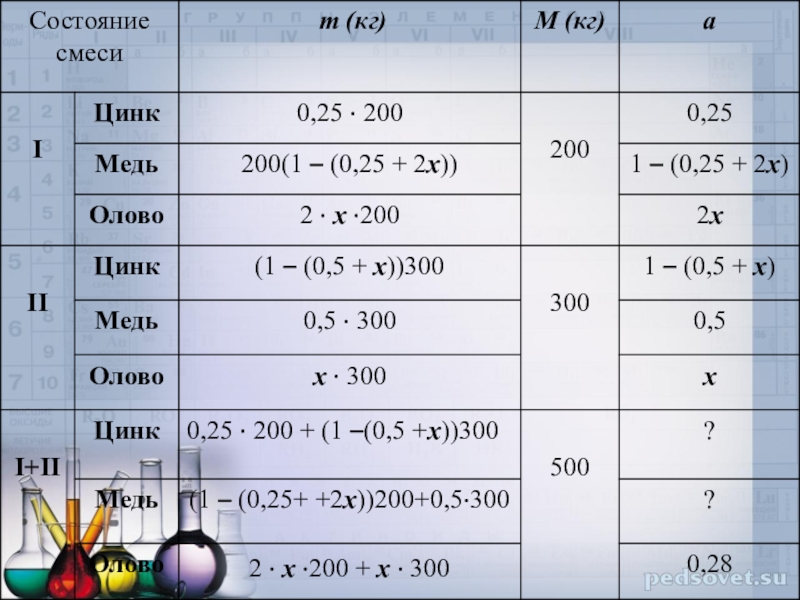 сплаве, тогда 2x – доля олова в I сплаве. Сначала определим долю олова в данных сплавах. Для этого заполним таблицу, выполнив переход от процентных содержаний к долям.