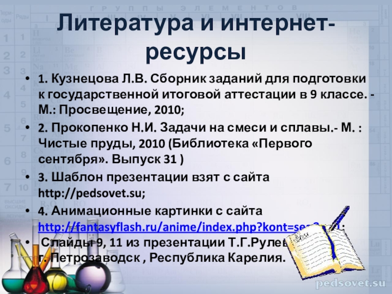2. Прокопенко Н.И. Задачи на смеси и сплавы.- М. :Чистые пруды, 2010 (Библиотека «Первого сентября». Выпуск 31 )
