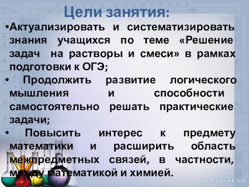 Повысить интерес к предмету математики и расширить область межпредметных связей, в частности, между математикой и химией.