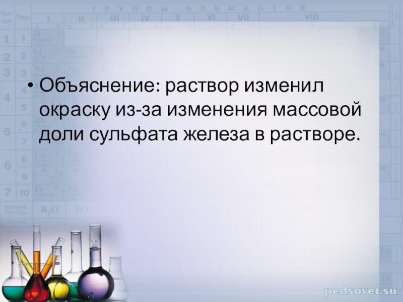 Слайд 9Объяснение: раствор изменил окраску из-за изменения массовой доли сульфата железа в