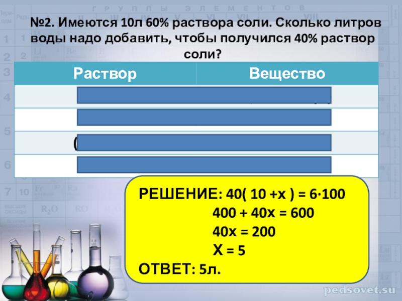№2. Имеются 10л 60% раствора соли. Сколько литров воды надо