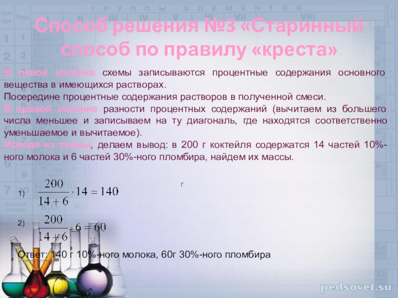 Исходя из схемы, делаем вывод: в 200 г коктейля содержатся 14 частей 10%-ного молока и 6 частей 30%-ного пломбира, найдем их массы.