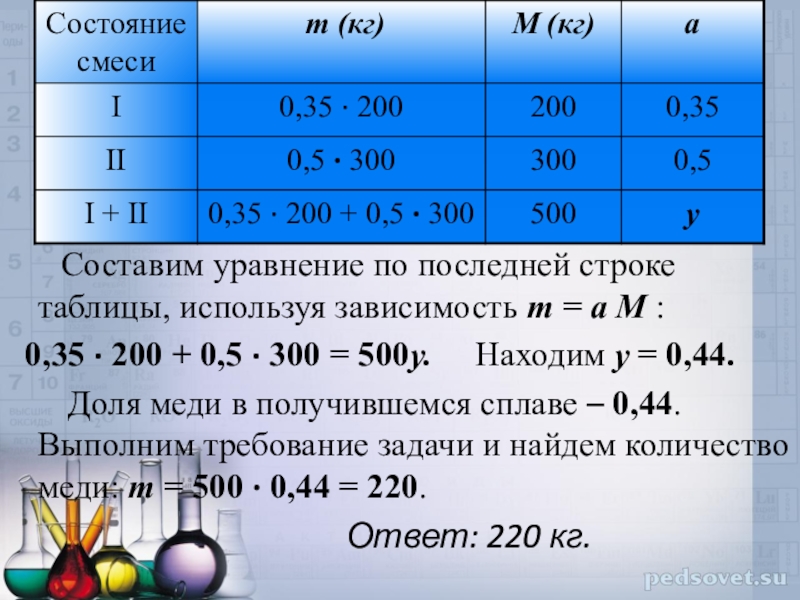 Доля меди в получившемся сплаве – 0,44. Выполним требование задачи и найдем количество меди: m = 500 · 0,44 = 220.