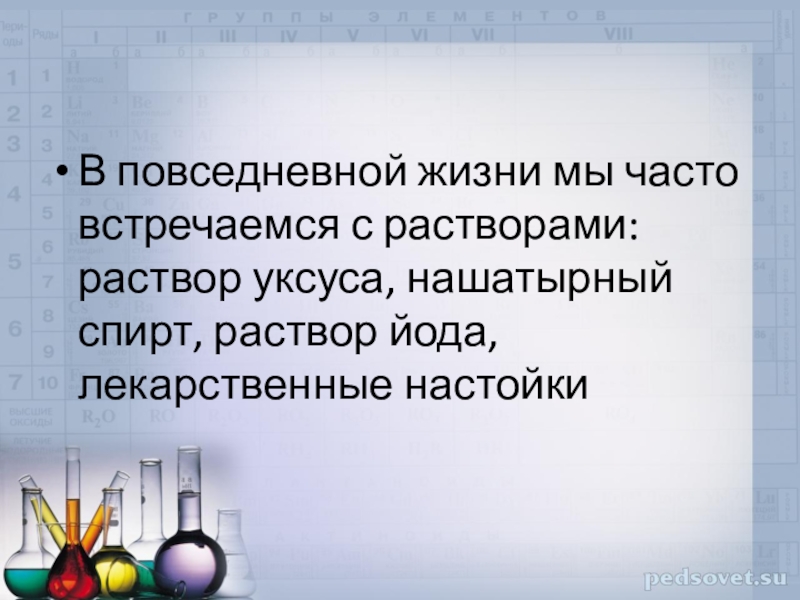 Слайд 10В повседневной жизни мы часто встречаемся с растворами: раствор уксуса, нашатырный