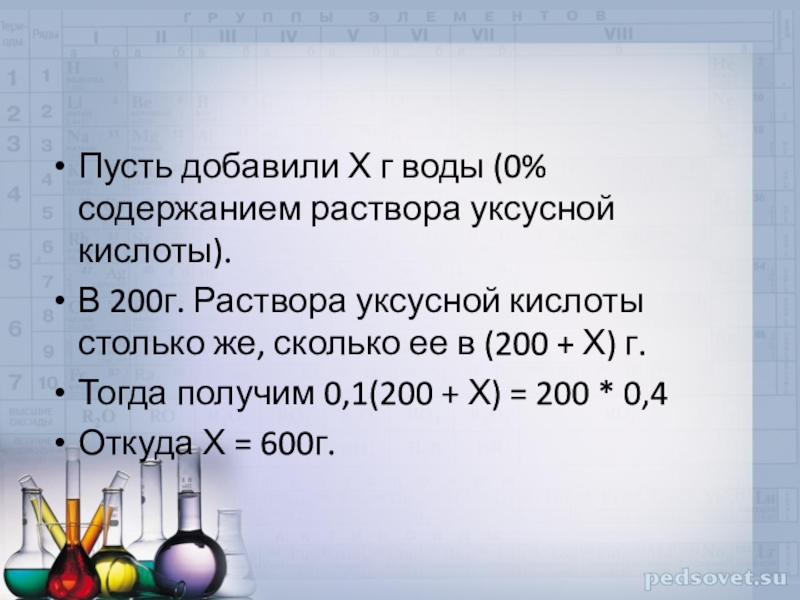 Слайд 14Пусть добавили Х г воды (0% содержанием раствора уксусной кислоты).