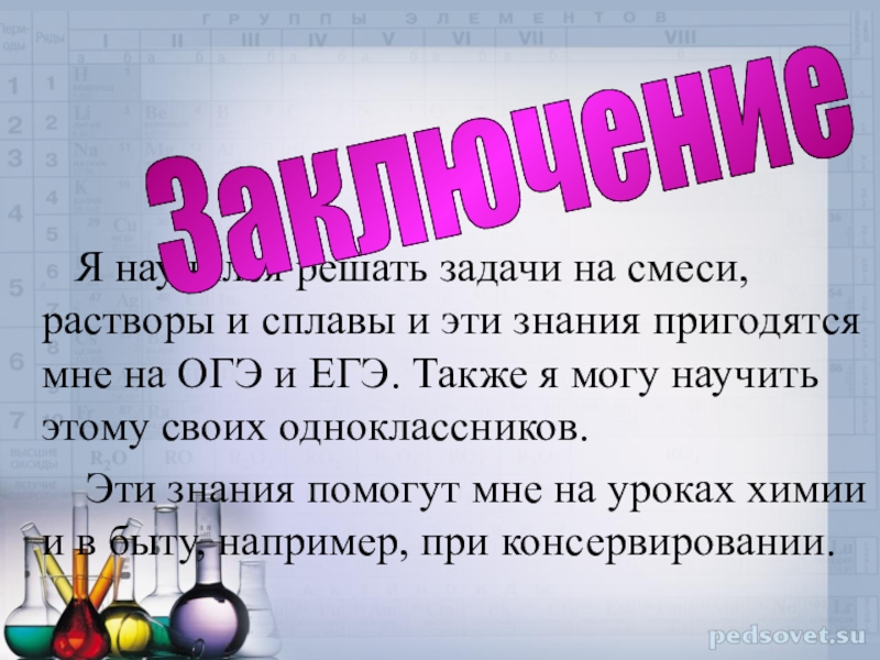 растворы и сплавы и эти знания пригодятся мне на ОГЭ и ЕГЭ. Также я могу научить этому своих одноклассников.