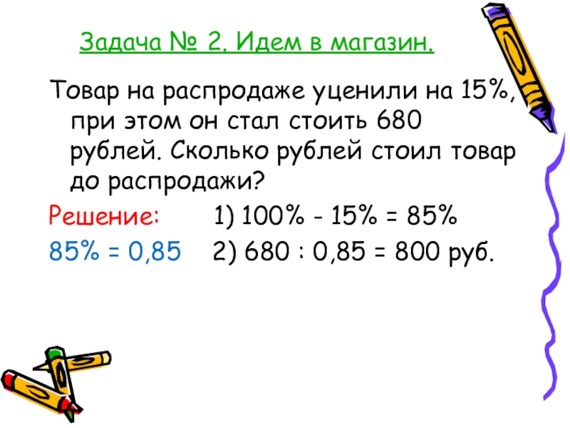 85% = 0,85 2) 680 : 0,85 = 800 руб.