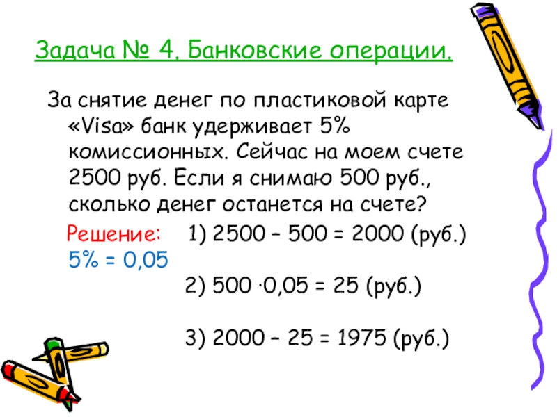 банк удерживает 5% комиссионных. Сейчас на моем счете 2500 руб. Если я снимаю 500 руб., сколько денег останется на счете?