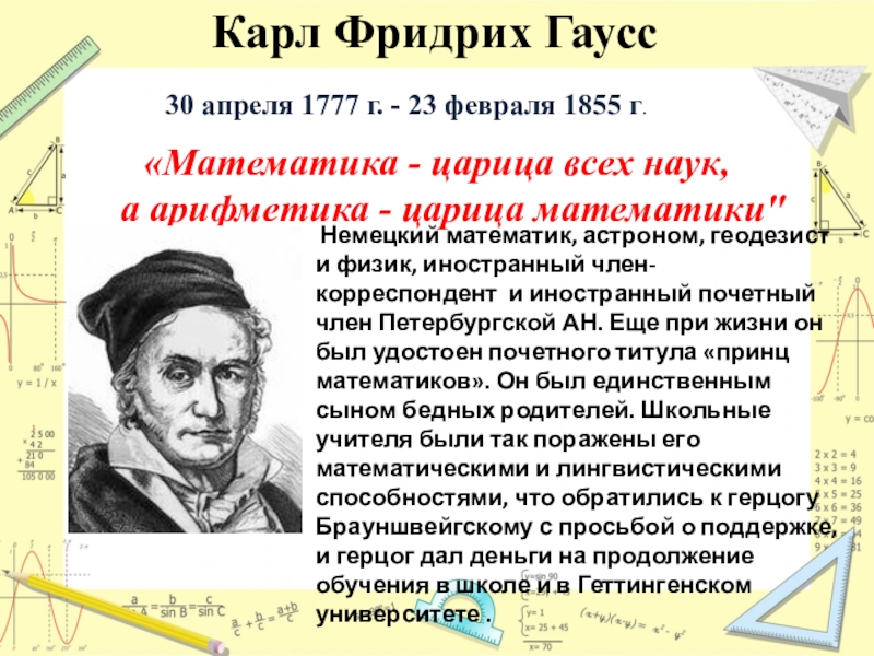 Немецкий математик, астроном, геодезист и физик, иностранный член-корреспондент и иностранный почетный член Петербургской АН. Еще при жизни он был удостоен почетного титула «принц математиков». Он был единственным сыном бедных родителей. Школьные учителя были так поражены его математическими и лингвистическими способностями, что обратились к герцогу Брауншвейгскому с просьбой о поддержке, и герцог дал деньги на продолжение обучения в школе и в Геттингенском университете .
