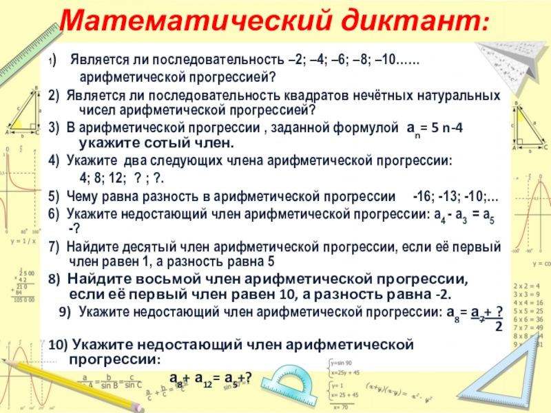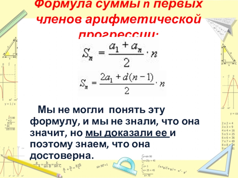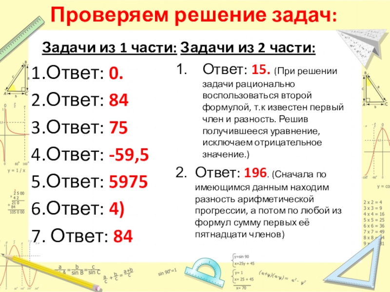 Ответ: 15. (При решении задачи рационально воспользоваться второй формулой, т.к известен первый член и разность. Решив получившееся уравнение, исключаем отрицательное значение.)