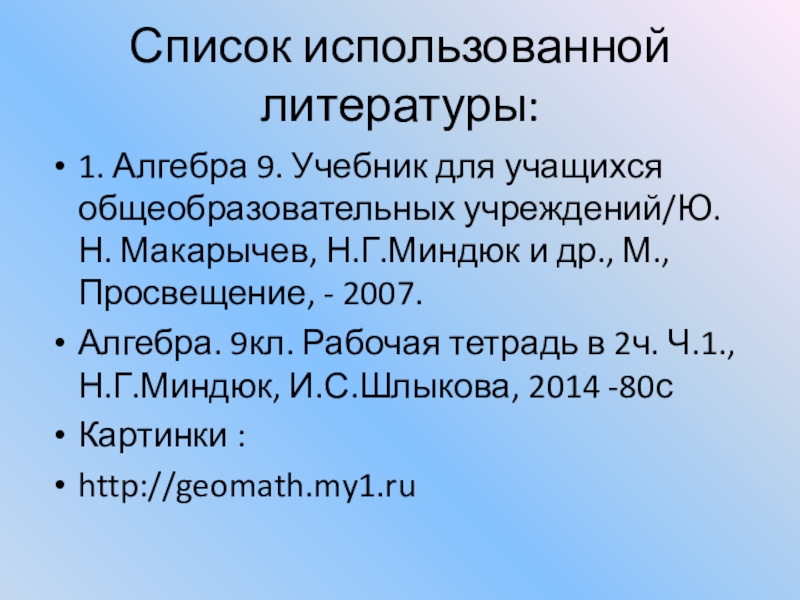 Список использованной литературы:1. Алгебра 9. Учебник для учащихся общеобразовательных учреждений/Ю.Н. Макарычев, Н.Г.Миндюк и др., М., Просвещение, -