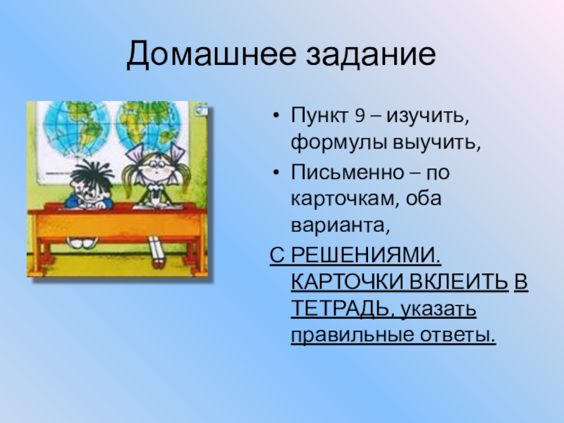 Домашнее заданиеПункт 9 – изучить, формулы выучить, Письменно – по карточкам, оба варианта, С РЕШЕНИЯМИ. КАРТОЧКИ ВКЛЕИТЬ