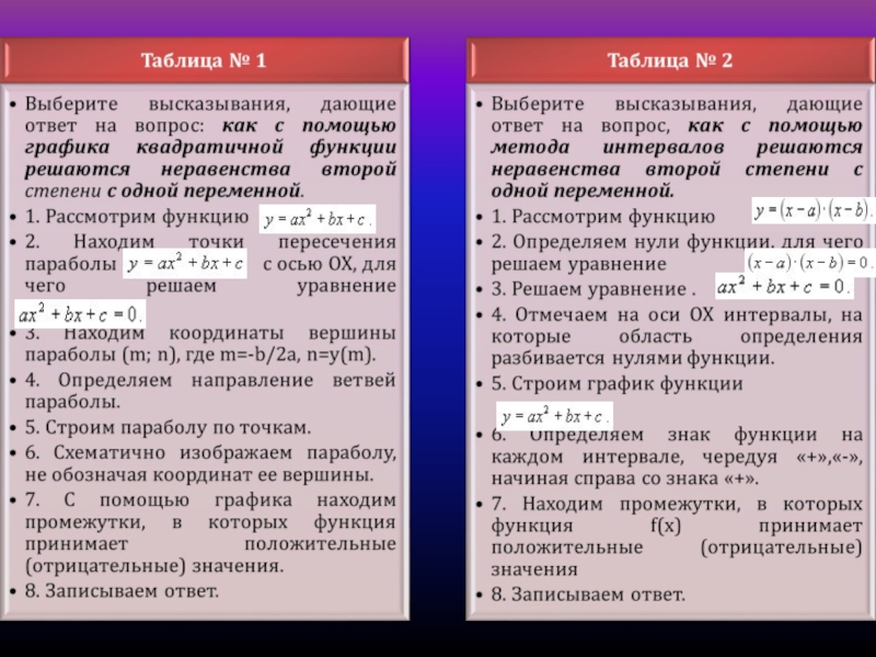 - решение квадратных неравенств исистем неравенств с одной переменной;