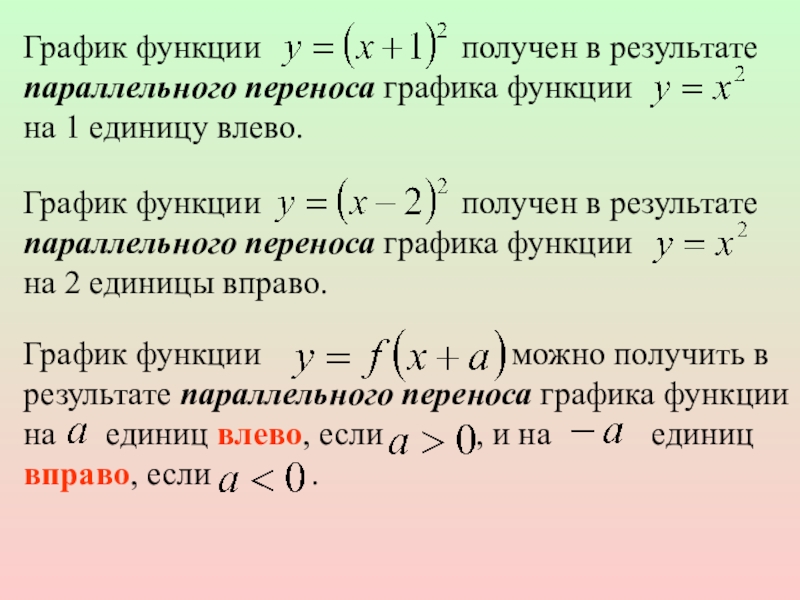 График функции можно получить в результате параллельного переноса графика функции на единиц влево, если , и на единиц вправо, если .