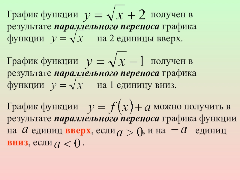 График функции можно получить в результате параллельного переноса графика функции на единиц вверх, если , и на единиц вниз, если .