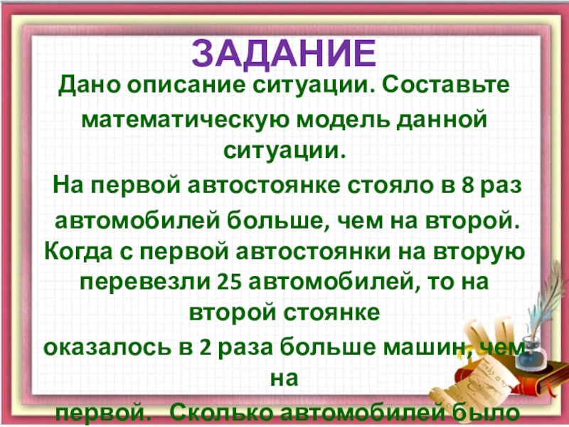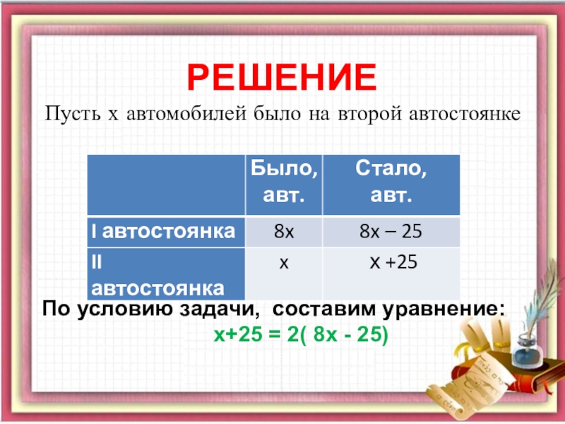 автомобилей больше, чем на второй. Когда с первой автостоянки на вторую перевезли 25 автомобилей, то на второй стоянке