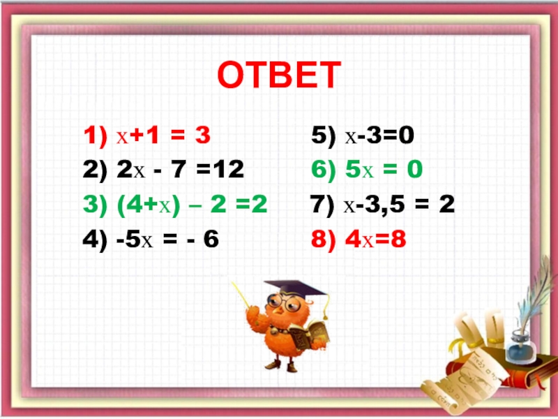 3) (4+х) – 2 =2 7) х-3,5 = 2