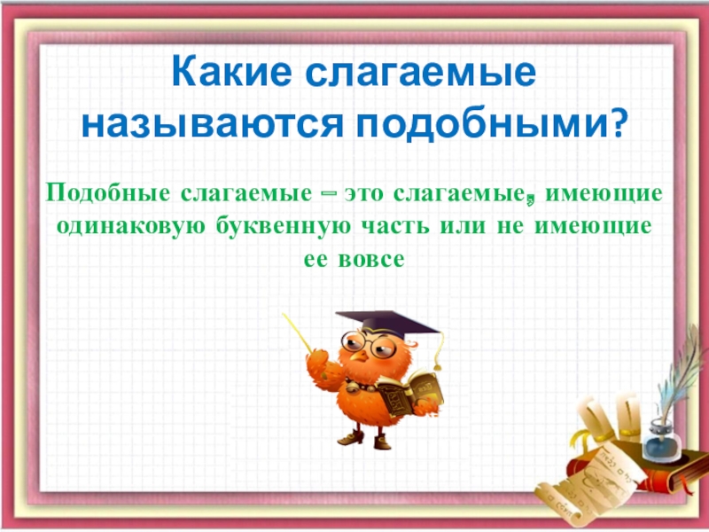 Подобные слагаемые – это слагаемые, имеющие одинаковую буквенную