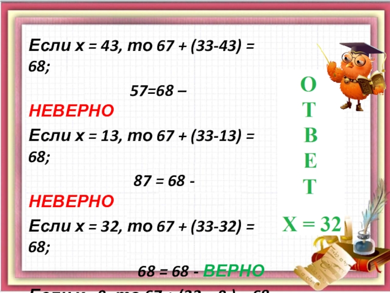 Слайд 19Если х = 43, то 67 + (33-43) = 68;