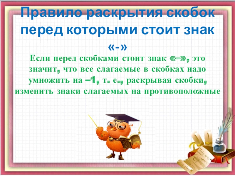 знак «–», это значит, что все слагаемые в скобках надо умножить на –1, т. е., раскрывая скобки, изменить знаки слагаемых на противоположные