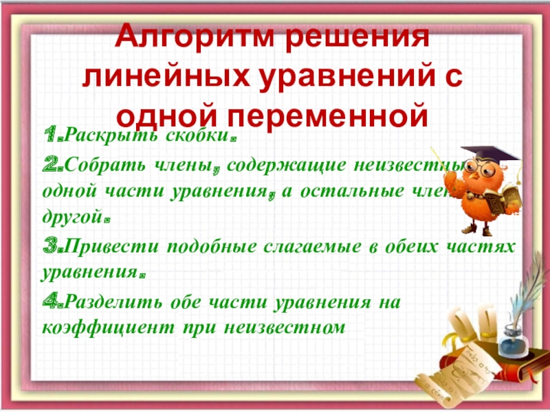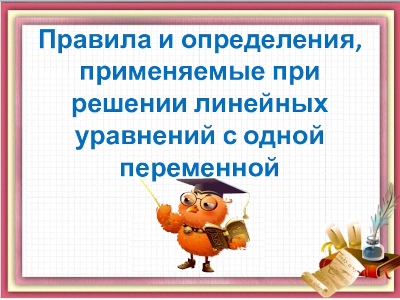Слайд 20Правила и определения, применяемые при решении линейных уравнений с одной переменной