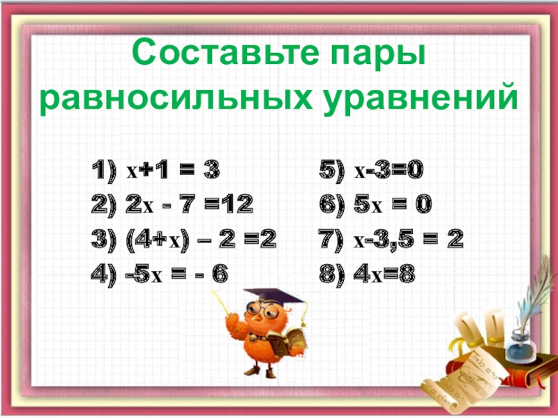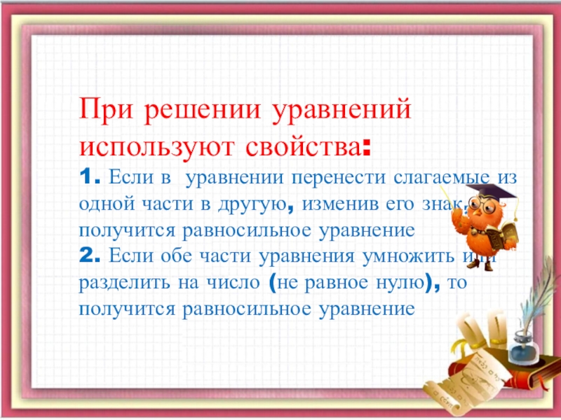 2. Если обе части уравнения умножить или разделить на число (не равное нулю), то получится равносильное уравнение