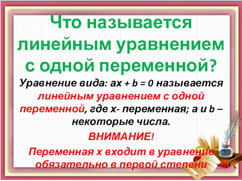 = 0 называется линейным уравнением с одной переменной, где х- переменная; а и b – некоторые числа.