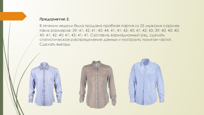 сорочек таких размеров: 39; 41; 42; 41; 40; 44; 41; 41; 42; 40; 41; 42; 43; 39; 40; 40; 40; 40; 41; 42; 40; 41; 43; 41; 41. Составить вариационный ряд, сделать статистическое распределение данных и построить полигон частот. Сделать выводы.