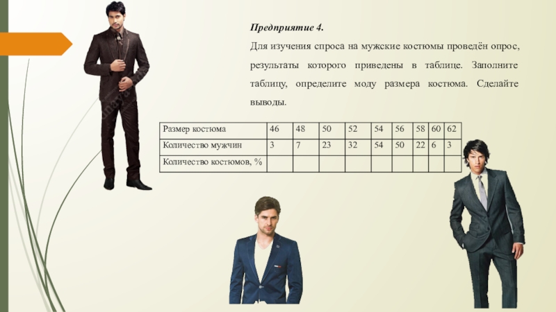 приведены в таблице. Заполните таблицу, определите моду размера костюма. Сделайте выводы.