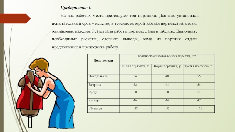 испытательный срок – неделю, в течение которой каждая портниха изготовит одинаковые изделия. Результаты работы портних даны в таблице. Выполните необходимые расчёты, сделайте выводы, кому из портних отдать предпочтение и предложить работу.