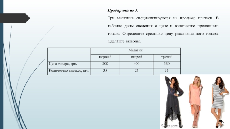Три магазина специализируются на продаже платьев. В таблице даны сведения