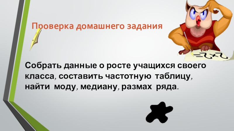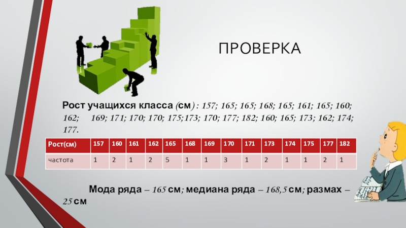 Мода ряда – 165 см; медиана ряда – 168,5 см; размах – 25 см