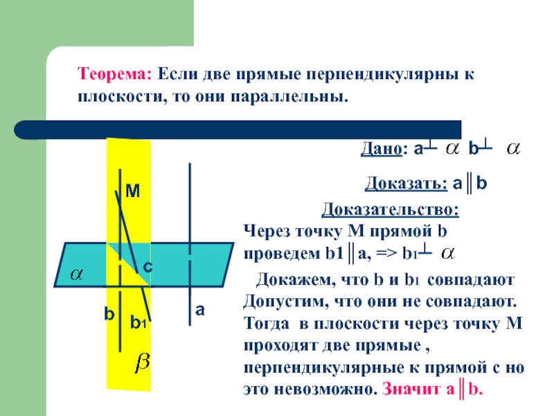 Допустим, что они не совпадают. Тогда в плоскости через точку М проходят две прямые , перпендикулярные к прямой с но это невозможно. Значит а║b.
