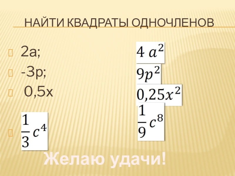 Найти квадраты одночленов 2а; -3р; 0,5х Желаю удачи!
