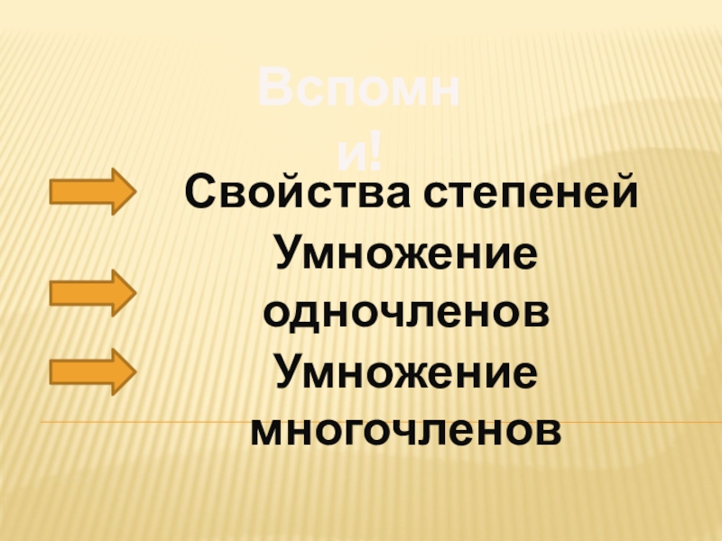 Вспомни!Умножение одночленовСвойства степенейУмножение многочленов